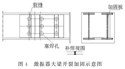 激振器大梁是設(shè)備強度最高的部位,發(fā)生開裂的情況甚少,但現(xiàn)場條件各有不同,若有開裂,其加固方案和底梁類似,但其坡口深度與鋼板厚度一致,焊接質(zhì)量要求高,副板以16mm~20mm鋼板為主,必要時副板上增加強筋。